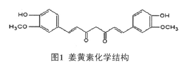 藥姜黃具有破血行氣、通經(jīng)止痛之功效,有效成分為姜黃素(curcumin)、脫甲氧基姜黃素及雙脫甲氧基姜黃素,姜黃素是其中主要有效成分[1]。姜黃素曾作為香料和食物色素廣泛用于食品工業(yè)[2],其結(jié)構(gòu)式見圖1。近年,姜黃素的藥理活性不斷發(fā)現(xiàn),如抗炎、清除自由基及抗癌等[3],其中一些藥理作用已進(jìn)入臨床驗(yàn)證階段?,F(xiàn)將近年國內(nèi)外有關(guān)姜黃素的臨床研究成果作一綜述,以期為姜黃素的應(yīng)用與開發(fā)研究提供參考。